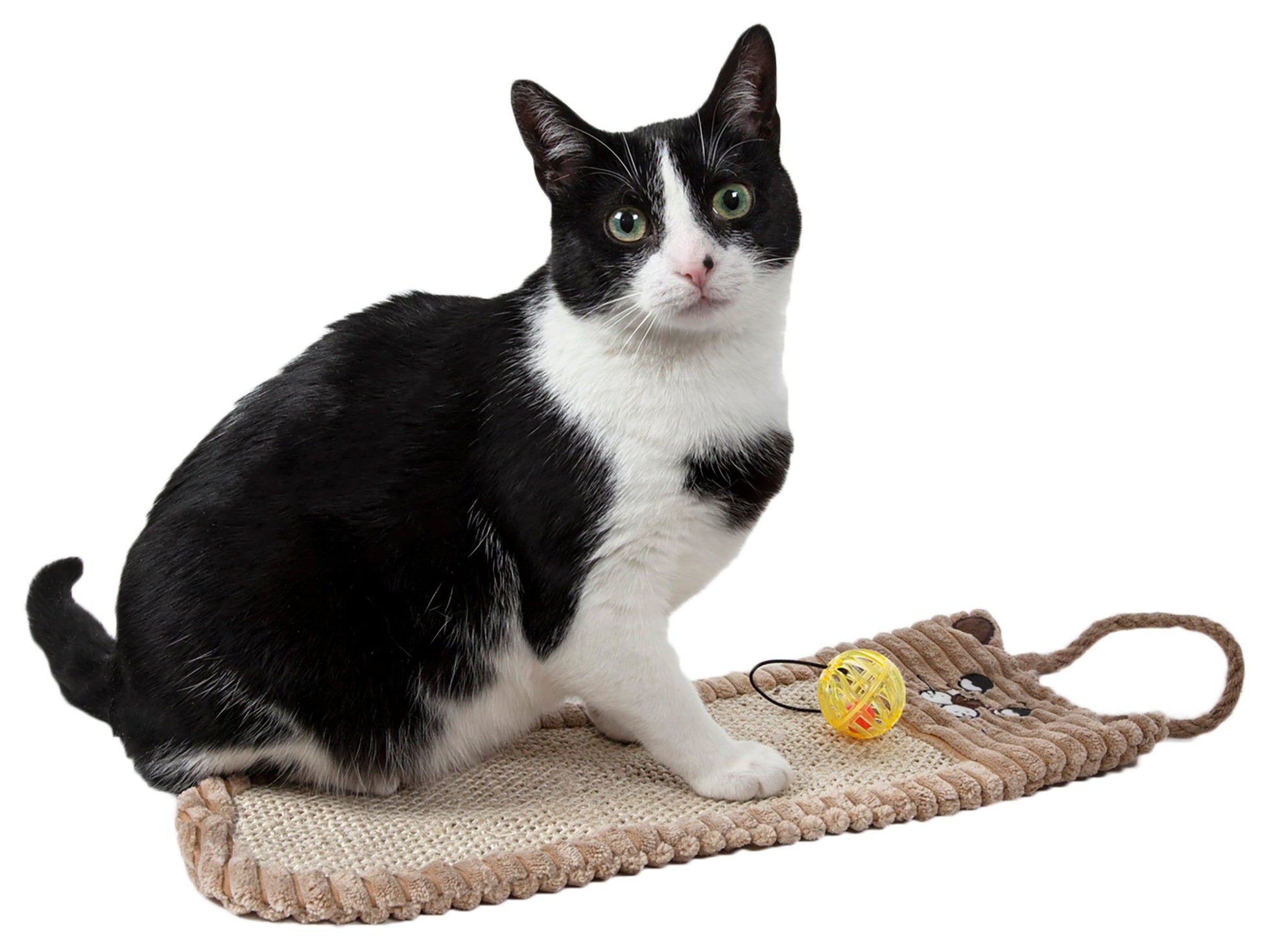 The Pet Life eco-natural sisal and jute hanging carpet cat scratcher is composed of natural and eco-friendly sisal and jute rope which can be wrapped around to hang on any door knobs or just about anywhere. This travel carpet cat scratcher features a comfortable and playful crinkle paper at the end by the rope area. The carpet scratcher is even large enough to be used as a cat scratching mat or lounge. Features an included built-in cat teaser rope ball toy and entices more standing movements great for exercising and balancing when hung on the door. Perfect for maintaining proper paw health and great for traveling. Features a flat animation design on the front. Available in Multiple Colors.