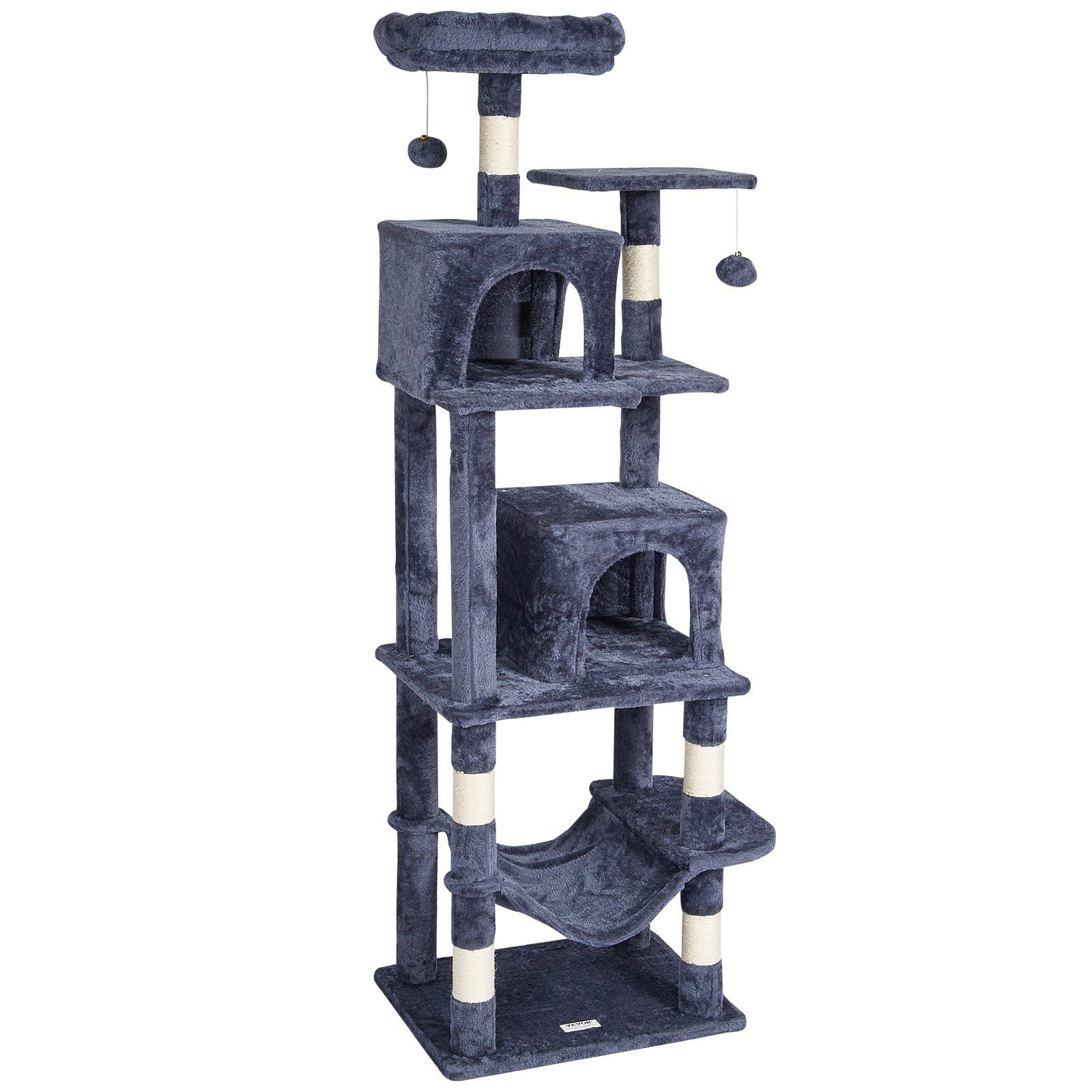 Let cats enjoy a comfortable and secure environment on this cat tower. With different resting areas including a spacious base, cozy hammock, 2 hidden cat condos, and soft top perch for cats to lounge, hide, or perch high.