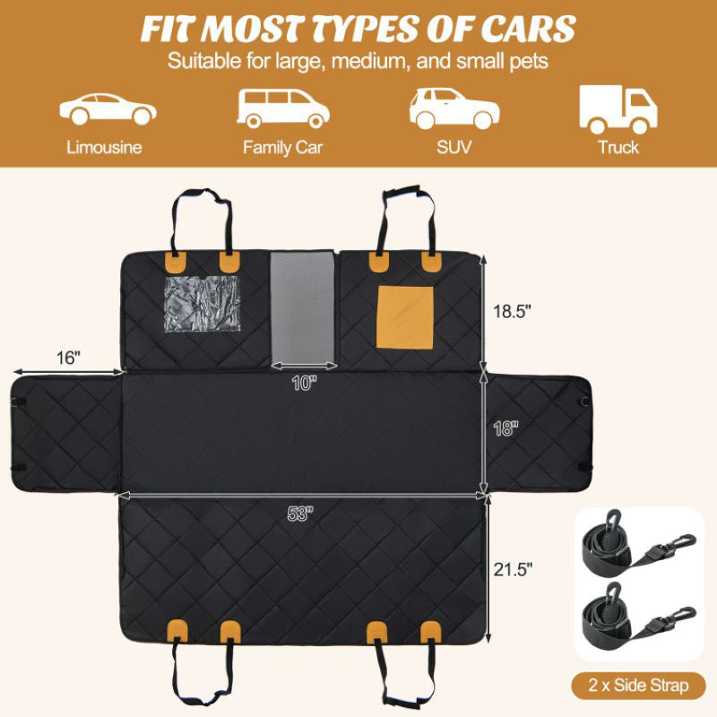 1.This car seat protector fits for large cars, large SUVs and trucks, which can be converted from a rear-seat hammock to a fitted back-seat cover, to a trunk cover for SUV travel